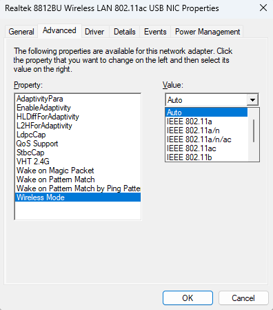 通過修改網(wǎng)卡屬性中的”高級“選項卡中的”無線模式",可實現(xiàn)指定頻段搜索Wi-Fi信號