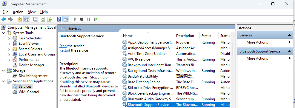 找到"Bluetooth Support Service"(Windows10/11顯示為“藍(lán)牙支持服務(wù)”)