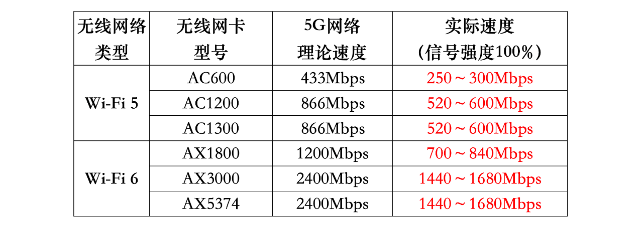 購買了合適的無線網(wǎng)卡,我們還需要一個合適的無線路由器搭配才能達(dá)到最優(yōu)的效果。Wi-Fi 5無線路由器選擇Wi-Fi 5無線網(wǎng)卡,Wi-Fi 6無線路由器可以選擇Wi-Fi 6無線網(wǎng)卡或Wi-Fi 5無線網(wǎng)卡都是可以的,不過更推薦Wi-Fi 6無線網(wǎng)卡哈。無線路由器實(shí)際使用中能達(dá)到的最高速度請參考下圖: