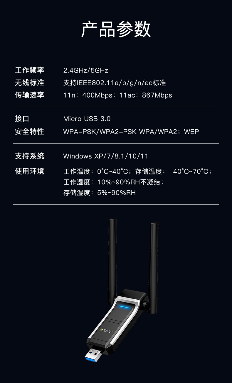 - EDUP EP-AC1701S是一款高性能雙頻USB 3.0無線網(wǎng)卡,采用MTK7612主控芯片,支持802.11ac無線標準。配備外置天線增強信號覆蓋,支持雙頻2.4GHz/5GHz自動切換,兼容20/40/80MHz頻寬,確保穩(wěn)定低延遲。支持WEP/WPA/WPA2加密,保障網(wǎng)絡安全,即插即用,是臺式機和筆記本升級Wi-Fi的理想選擇。