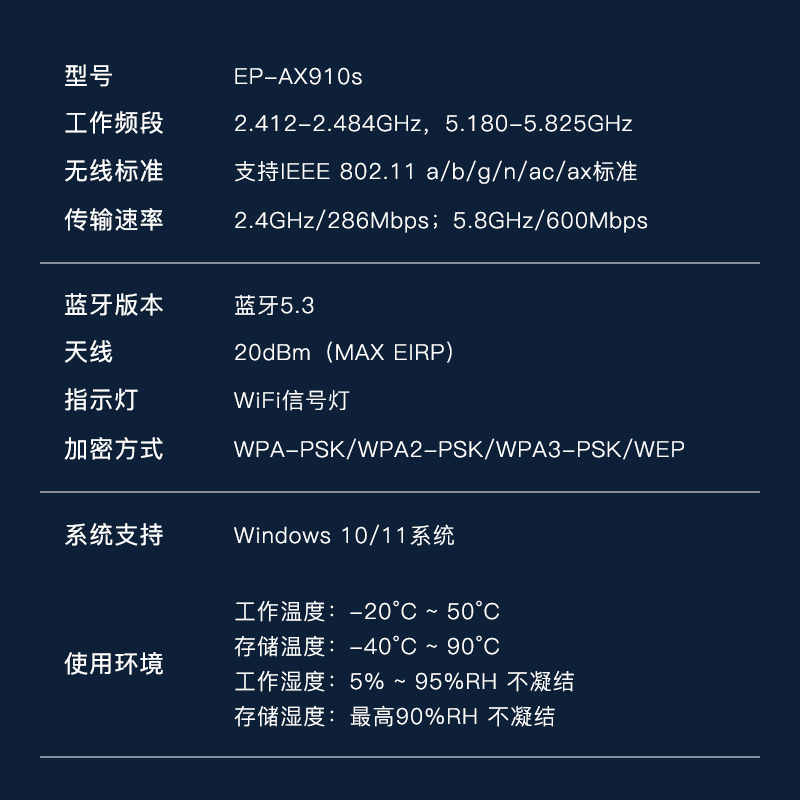 - 技術(shù)標準:IEEE 802.11ax(Wi-Fi 6)、g、b、n,向下兼容