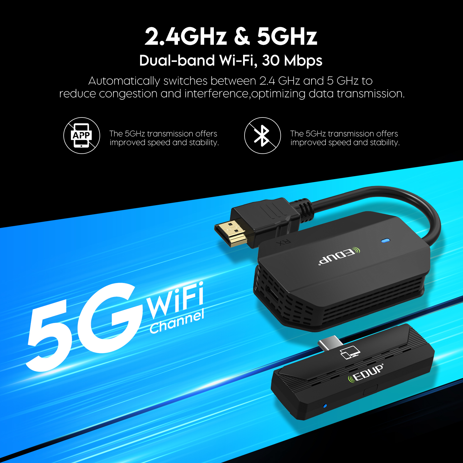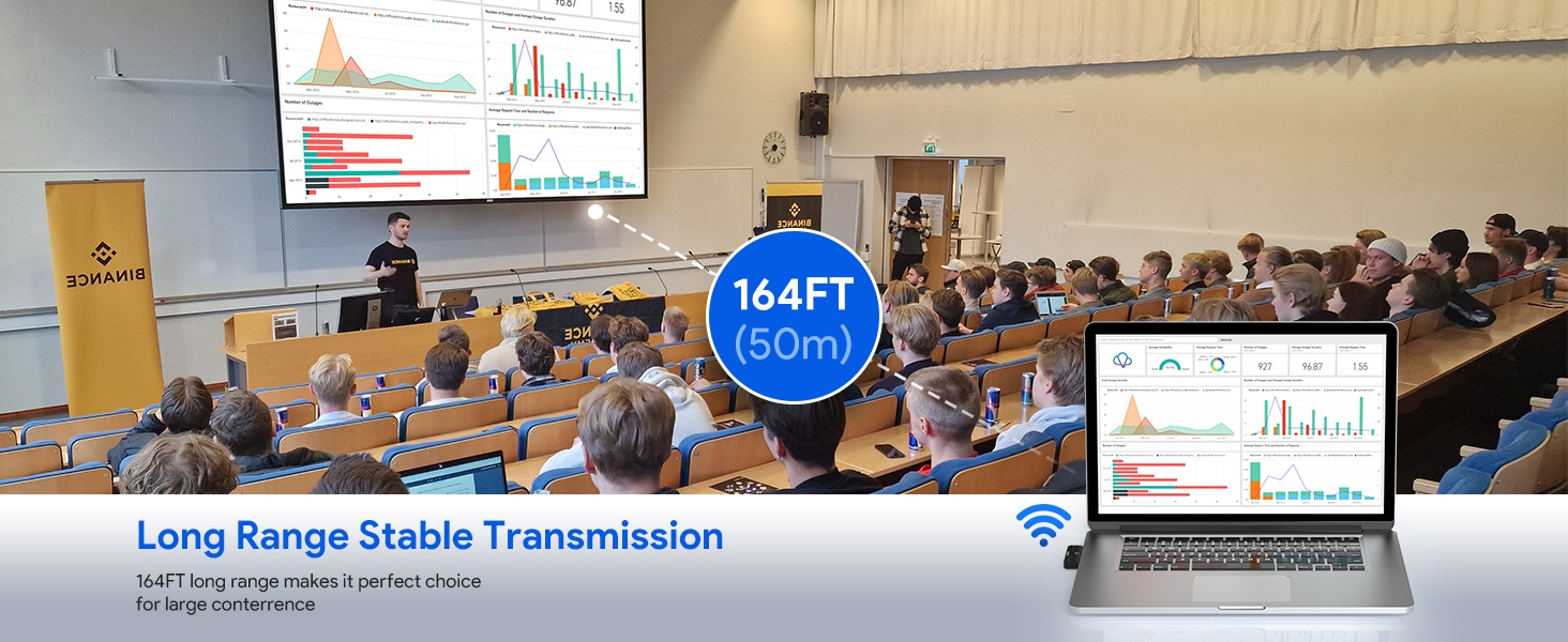 - 長(zhǎng)距離傳輸:支持 2.4G/5G 雙頻段,在無遮擋情況下傳輸距離可達(dá) 164 英尺,可自動(dòng)選擇頻段模式。