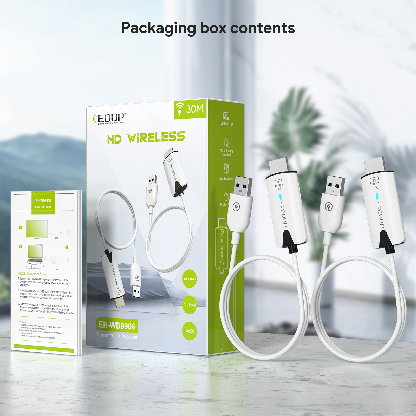 - EDUP 無線 HDMI 收發(fā)套件可實現(xiàn)小屏設(shè)備(如臺式機、PC)到大屏設(shè)備(如電視、顯示器、投影儀)的零延遲無線視頻傳輸,音畫完美同步。得益于內(nèi)置天線設(shè)計,安裝簡單,只需將 HDMI 和 USB 線分別連接至發(fā)送端和接收端設(shè)備即可。