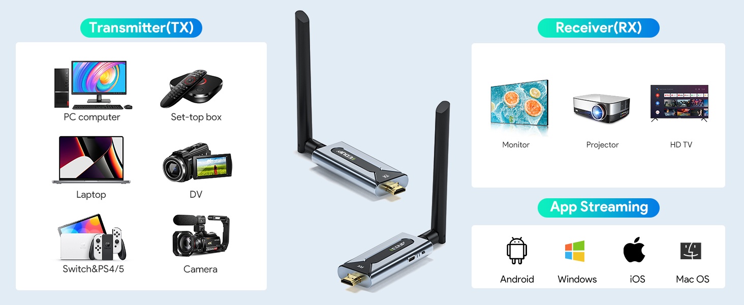 - 即插即用:簡(jiǎn)單設(shè)置,發(fā)射端連接信號(hào)源,接收端連接顯示設(shè)備,5V/1A供電,支持多信號(hào)源輸入,小巧便攜。
